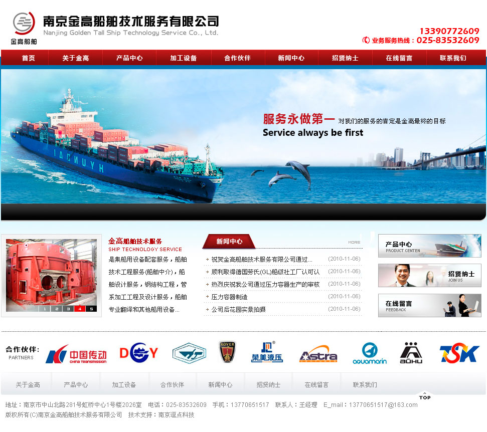 南京金高船舶技術服務有限公司是集船用設備配套服務,船舶技術工程服務(船舶中介),船舶設計服務,鋼結構工程,管系加工工程及設計服務,船舶專業(yè)翻譯和其他船用設備的服務公司。本公司與國內多家大型船廠和大型鋼結構企業(yè)有著良好的合作關系,其中包括南京武家嘴船廠,江蘇鼎衡船業(yè),江蘇科進船業(yè),南京高精船用設備公司,鎮(zhèn)江同舟螺旋槳公司,滁州(南京)大益船舶,南通沿江管業(yè)公司。本公司還與國內多家船舶設計院有著良好的關系,設計院包括上海船舶研究設計院、上海佳豪船舶設計院、中國船舶工業(yè)第七零八研究所、上海恒波設計公司、南京歐海船舶科技公司等。本公司管理層致力于中國船舶業(yè)的發(fā)展,把船舶配套服務作為公司發(fā)展的主線。使本公司代理的南高齒的船用推進系統(tǒng)能廣泛的運用到全世界的船舶上。本公司的宗旨是:優(yōu)質服務,誠信做人,互惠互利,共同發(fā)展。目的是促進國產船用設備的發(fā)展和提高國產船用設備的市場占有率。